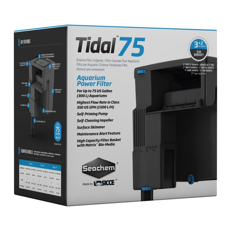 Der SEACHEM Tidal 75 Filter ist ein Schwebefilter der neuesten Generation mit einer Durchflussrate von 1500 L/h . Es wurde speziell für Süß- und Meerwasseraquarien mit einem Volumen von bis zu 300 l entwickelt.