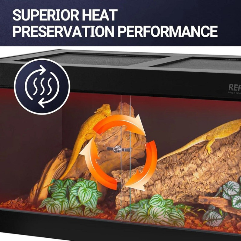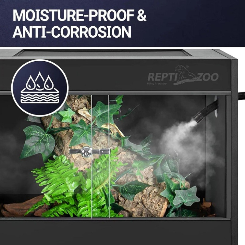Das aus hochwertigen Materialien hergestellte REPTI ZOO PVC-Terrarium lässt sich außerdem sehr einfach und schnell zusammenbauen. Dank der Kabeltüllen ist die Installation Ihrer Elektrogeräte einfach. Seine Lüftungsgitter an der Oberseite sorgen für eine gute Belüftung Ihres Reptils.