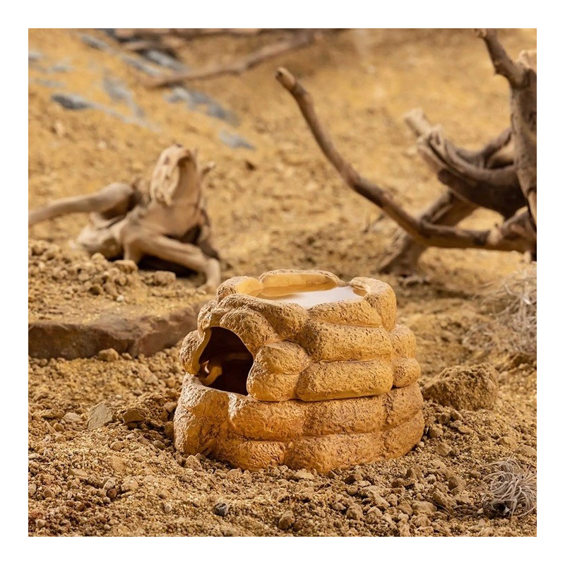 Um optimale Temperatur- und Feuchtigkeitsniveaus für Ihre Tiere (und ihre Eier) im Terrarium aufrechtzuerhalten, stellen Sie sicher, dass der Wasserbehälter der Big Rock Hygroscope Cave immer gefüllt ist.