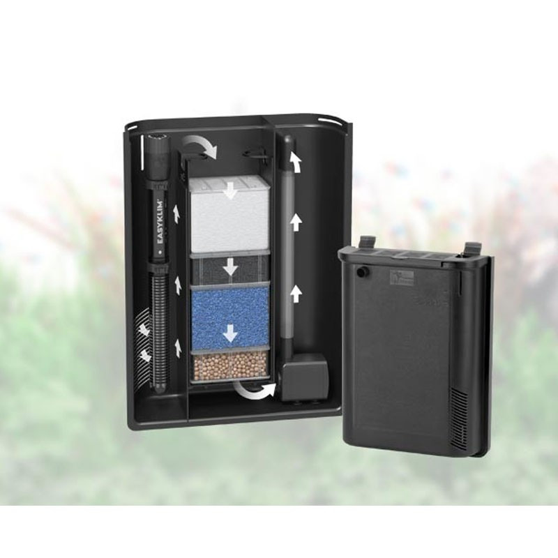 Système de filtration équipé de pompe à eau EasyFlux, de chauffage EasyKlim et de masses filtrantes EasyBox. Les cartouches efficaces EasyBox éliminent complètement les résidus polluants accumulés dans l’eau, la laissant propre et claire, offrant les meilleures conditions pour les espèces.