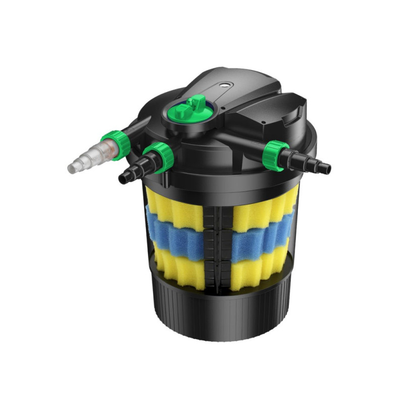 Amtra Pond Prexure Filter 12000 est également équipé d’un système de lavage à contre-courant et d’un système de nettoyage mécanique automatique des éponges filtrantes. Pour conserver un débit optimal les éponges du filtre doivent être nettoyées régulièrement, environ toutes les 1-2 semaines.