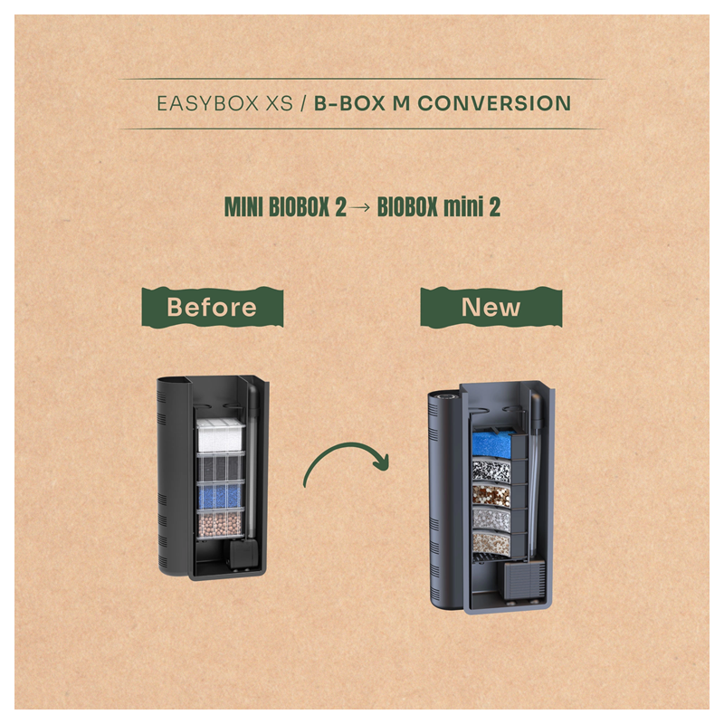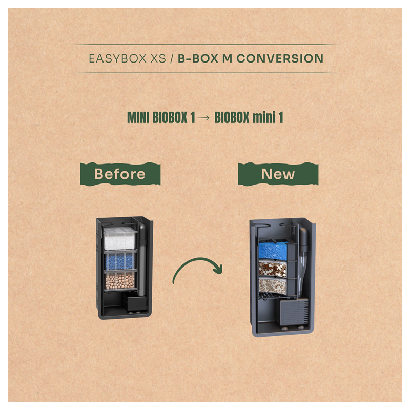 Toutes les anciennes versions des filtres Mini Biobox peuvent être mises à niveau grâce à ce kit de conversion compatible.