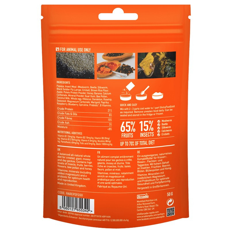 Arcadia Sticky Food Gold est une nourriture naturelle de qualité spécialement développée pour les geckos à crête, gargouille et géant. Les geckos diurnes comme les Phelsuma apprécieront aussi beaucoup cette nourriture. Cette source nutritive complète favorisera la santé et le développement de ces animaux.