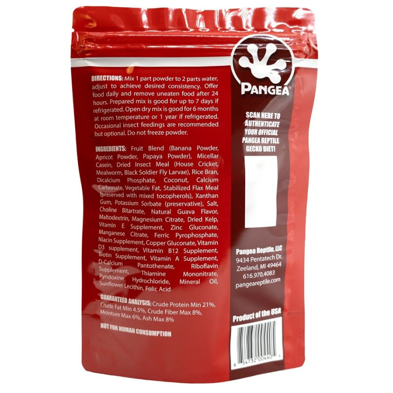 Pangea Gecko Diet Insects est considéré comme l'un des régimes alimentaires les plus populaires pour geckos à crête (Correlophus ciliatus). Il est idéal pour les geckos gargouilles (Rhacodactylus auriculatus), les geckos géants de Nouvelle-Calédonie (R. leachianus), les geckos à queue préhensile moussus (Mniarogekko chahoua), les geckos diurnes (Phelsuma spp., Lygodactylus spp.) et tous les autres geckos frugivores.