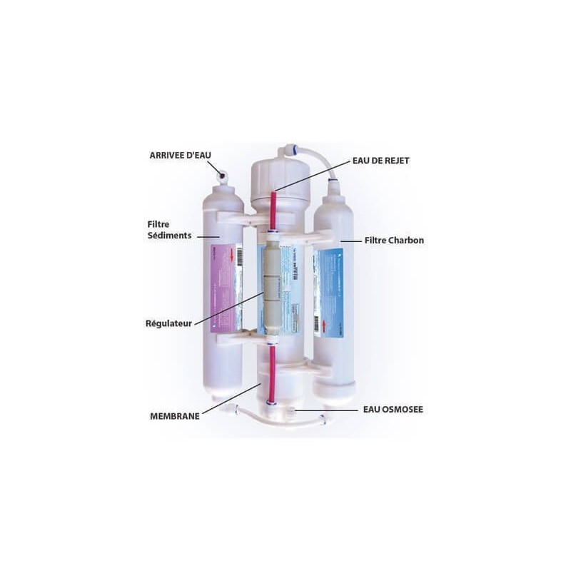L'osmoseur KBO 50 d'OSMOPUR comprend trois sections (voir schéma). La membrane, un filtre à sédiments et un filtre à charbon actif.