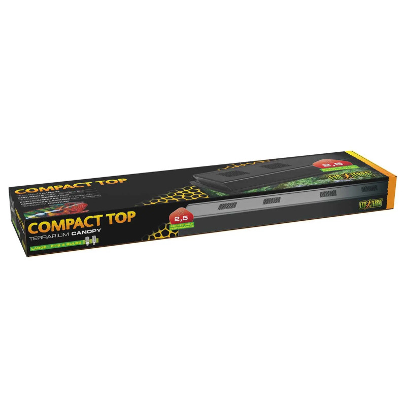 Le Compact Top Large Exo Terra est un couvercle d’éclairage compact conçu pour les grands terrariums grillagés. Il permet d’installer jusqu’à 4 ampoules fluocompactes ou LED afin de créer un éclairage adapté aux besoins spécifiques de vos reptiles, amphibiens ou invertébrés.