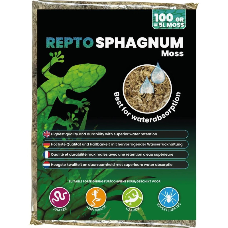 Repto Sphagum Moss est un substrat pour terrarium à base de sphaigne. Grâce à son excellente capacité d'absorption de l'eau elle est idéale conserver une bonne humidité dans l'environnement de vos animaux.