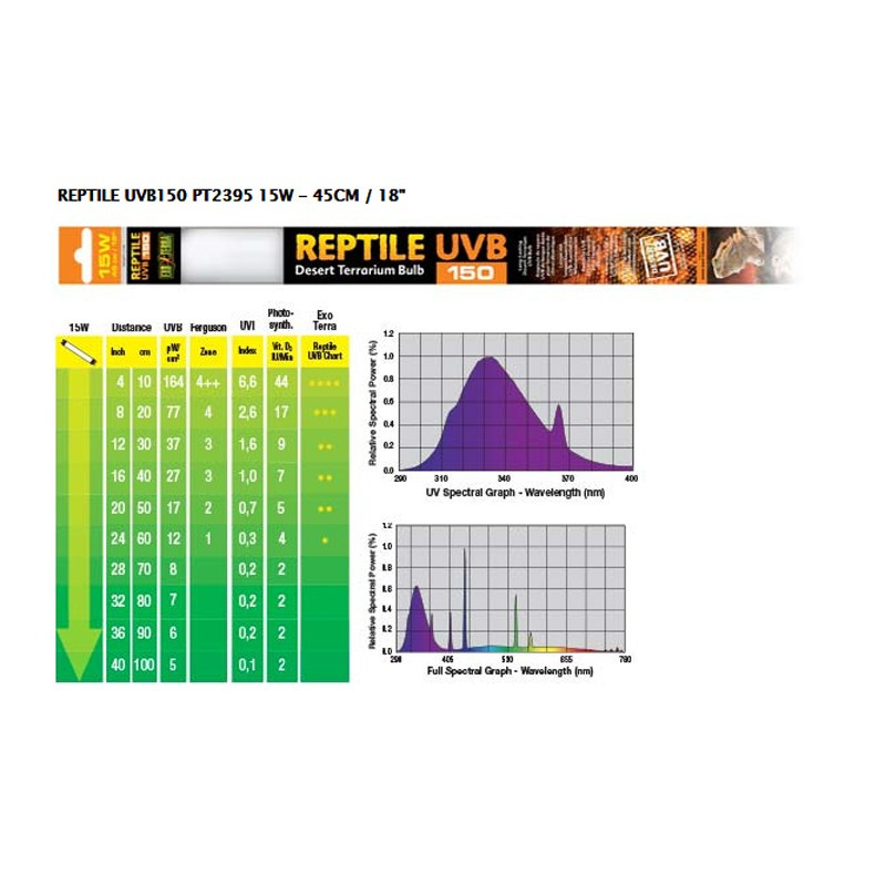 Le tube fluorescent pour reptiles EXO TERRA Reptile UVB 150 15 W T8 a un rendement UVB très élevé semblable à la lumière du soleil dans le désert.